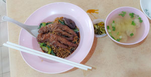 7.40 am - my wanton noodles with mushroom chicken feet. He ate the claws. Too much noodles for me but I ate them all because it is early in the morning so should have lots of time to use up the energy.