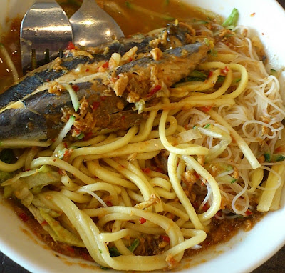 Assam Laksa with lots of raw vegetables on top - shredded cucumber, lettuce and onion in a sourish broth thick with shredded fish. Tastes good although it was more sweet than sour and not that hot and spicy.